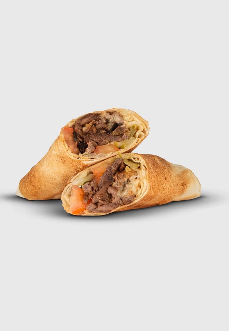 Tender beef shawarma, onions, parsley, tomatoes, pickles, and tahini—perfectly wrapped for hearty, bold Mediterranean flavor.