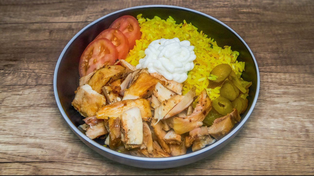 Includes chicken, rice, tomato, pickles, garlic paste. Add extra protein for an additional charge.