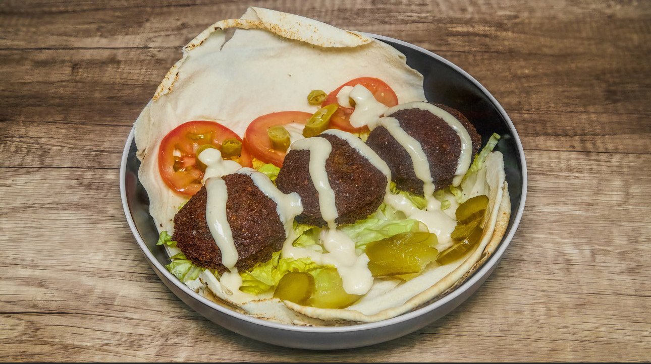 This delicious vegan sandwich includes freshly fried falafel topped with Tomato, Lettuce, Pickles, and Tahini sauce.