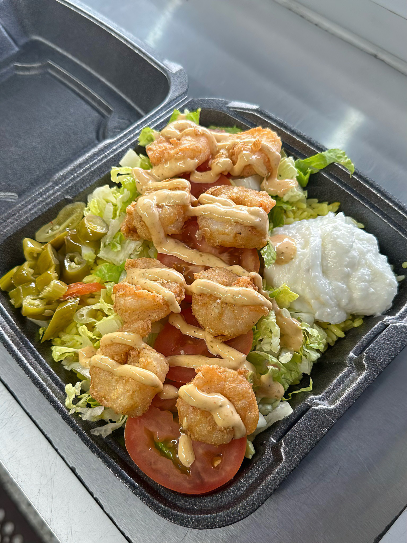 This delicious shrimp plate includes 8 Pieces of shrimp, rice, spicy veggies, tomato, lettuce, garlic paste, & horseradish sauce.